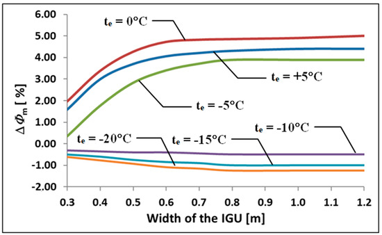 It was found that the described effect is important for the currently sold glazing in “mild winter” conditions, i.e., when the outside temperatures fluctuate within between −5 °C and 5 °C. For IGU width above 0.7m, the ratio ∆Φm changes from 3.9% to 5.0%. These values are characteristic of the average temperature during the winter months in many places around the world.