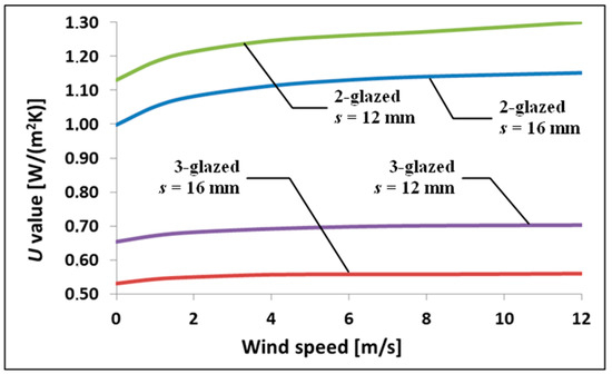 Wind velocity has an indirect effect on heat loss. It is a factor influencing external thermal surface resistance on the outside, which translates into the Ug-value. Graphic illustration of this effect is shown in Figure 7. The calculations were made for units with gap thickness of 16 mm. It can be noted that in the case of triple-glazed IGUs, the effect of wind velocity is negligible.