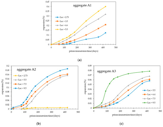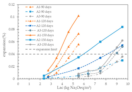 Figure 7 shows the expansions of the concrete prisms made with a given aggregate measured at the considered immersion time, plotted as a function of the initial alkali content (initial Lac) of the concrete mixes investigated (