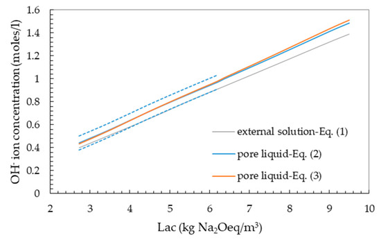 As discussed in the preceding section, there is a little but systematic difference between the OH− ion concentrations of the external alkaline solutions ([OH−]ext) designed by Equation (1) and the OH− ion concentrations in the pore solutions calculated by Equation (3) ([OH−]p). The [OH−]p/[OH−]ext ratio varies from 1.075 to 1.097 and on average is equal to 1.084. Therefore, a correction factor of 1.084 should be applied to Equation (1) for better designing the external alkaline solutions to be used in the proposed accelerated CPT. However, further investigation including pore liquid extraction and analysis on concrete specimens with different Lac values is needed to investigate about the relationship between the [OH−]p/[OH−]ext and βa/βw ratios under the specific conditions of the test method.