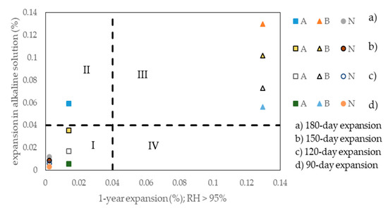 The horizontal and vertical dotted lines corresponding to an expansion level of 0.04% for the two test methods are also drawn. Thus, this figure is divided into four zones. Zones I and III are both congruity zones: Zone I indicates not alkali-reactivity and zone III alkali-reactivity. Zone II and IV are both incongruity zones.