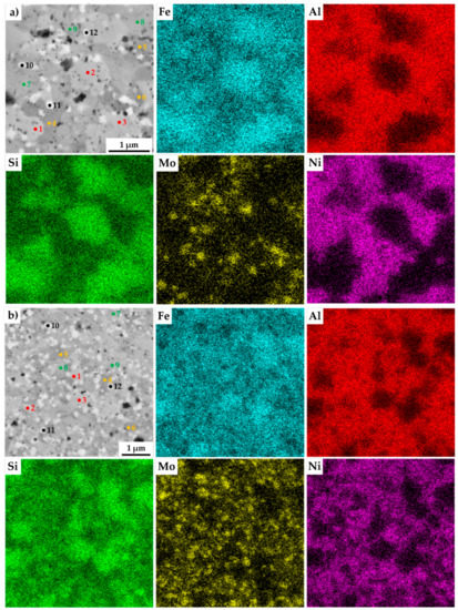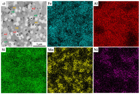 The results of the point analysis show the already mentioned enrichment of binary FeSi and Fe3Si phases by other alloying elements, namely of Al. Its concentration ranged in the FeSi phase, regardless of the chemical composition of the MA + SPS alloy, from 14.2 up to 16.4 at %. The same phase contained a significantly lower amount of Ni whose concentration decreased from 3.3 at % to 1.3 at %, reflecting the decreasing content of Ni in the MA + SPS alloy. On the other hand, the Fe3Si phase showed the supersaturation of Ni, whose lowest concentration of 8.5 at % further increased up to 19.3 at.% in the FeAl20Si20Mo5Ni15 alloy. Both the binary silicides contained only small amounts of Mo below 3.0 at %. The ternary Fe3Al2Si3 phase was showing a competing substitution of Ni and Mo, which had content that was changing concerning the chemical composition of the investigated alloy. Despite this, the AlMoSi phase showed, as the only one, almost constant chemical composition across all the investigated alloys. All of the present phases were showing the enrichment of other elements, while the chemical composition was shifted out of the equilibria state.