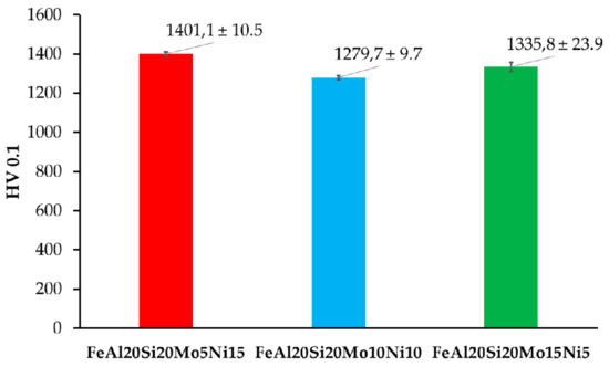 The prepared alloys were after compaction via SPS tested for Vickers hardness, whose results are shown in Figure 5. As is shown, all the prepared MA + SPS alloys exhibited high hardnesses, which exceed those observed in only the ternary FeAl20Si20 alloy prepared in our previous research [37]. In direct comparison, the FeAl20Si20Mo5Ni15 exceeded the hardness of FeAl20Si20 alloy by almost more than 300 HV 0.1. Such an increase in hardness can be attributed to a higher content of especially FeSi and Fe3Al2Si3 phases which reached in total up to 58.5 wt % for the first alloy (see Table 2). These phases, respecting the order of their appearance, are known to exhibit hardnesses up to 958 HV and 1553 HV, respectively. The presence of the Fe3Si phase more than surely softened the alloy since exhibiting a maximal hardness of 514 HV [16,19].
