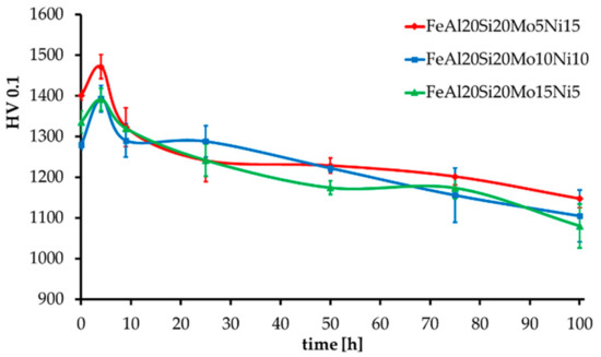 The MA + SPS alloys have also been tested for thermal stability, which was expressed as hardness change during long-term annealing at 800 °C, as shown in Figure 6. All the alloys showed an initial increase in hardness by approximately 60 HV 0.1, followed by a slow decrease in hardness as the duration of annealing prolonged up to a total of 100 h. In the end, all the alloys showed, considering the confidence intervals, almost identical values of hardness reaching over 1100 HV 0.1. The highest hardness prior and after the tests was obtained by the FeAl20Si20Mo5Ni15 alloy, which contained the highest volume fraction of FeSi, Fe3Si, and Fe3Al2Si3 phases reaching up to 91.5 wt %. During the first 4 h of annealing, the hardness increased probably due to a formation of precipitates within the material, which further either dissolved or coarsened, reducing its strengthening contribution toward the alloy. Such a presumption might be supported by the already-mentioned enrichments of present phases by other elements due to a non-equilibria preparation process. A further decrease in hardness was caused by the microstructural coarsening of each constituent.