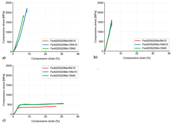 The MA + SPS alloys were also tested at an elevated temperature of 800 °C (Figure 7c). During these tests, all of the previously brittle alloys changed their behavior, exhibiting significant plasticity due to the activation of non-discrete dislocation movements. Although the tests were done at elevated temperature, the FeAl20Si20Mo10Ni10 and FeAl20Si20Mo15Ni5 showed almost identical values of compressive yield strength (CYS), which were 428 and 437 MPa, respectively.