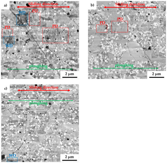 To fully describe the mechanical properties, the alloys were also tested by the pin-on-disc method to determine wear-related characteristics. After the tests, the morphology of wear tracks was observed with SEM, as is shown in Figure 8. The wear tracks show the presence of thermally induced microcracks whose origins were randomly distributed across all the present phases. Among that, some areas were showing the presence of wrinkles, which were pointed at localized plastic deformation (PD) within the wear track. Such behavior comes along with the already observed plastic deformation during compressive tests at elevated temperature. However, since the wear tests are highly localized, the heat dissipation in the bulk of the material is enormous, allowing the creation of thermally induced cracking of the surface. Besides, the wear debris (WD) at the ends of the wear tracks were composed of oxides, which confirms the presumption. These particles, which were mostly composed of different oxides, were also randomly present in the wear track as is shown, especially in Figure 8a.