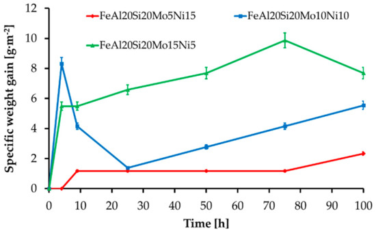 The MA + SPS alloys have also been investigated for cyclic oxidation resistance at 800 °C during the early beginnings in standard atmosphere. All the alloys formed a layer made of oxidic products without any traces of delamination. The layer growth during the first hours of annealing manifested as a steep weight increase followed by a decrease in weight gain speed, since the layer has been effectively shielding the material, slowing the kinetics of oxidation. The initial steps of the oxide layer formation were reaction controlled, while a steep decrease in a weight gain suggested the formation and growth of a protective oxidic membrane whose presence further slowed oxidation. Thus, as the time of oxidation prolonged, the kinetics became controlled by oxygen diffusion through the developed oxidic layer. As is shown in Figure 9, all of the MA + SPS alloys showed exceptional oxidation resistance as the time of the test prolonged, which corresponded to a formation of the protective oxidic barrier. The highest oxidation resistance was observed in the case of FeAl20Si20Mo5Ni15 alloy, which during the first 4 h of cyclic oxidation did not create any traces of an oxidic layer. As the duration of the oxidation test prolonged, the same alloy developed a compact layer of oxides which effectively shielded the material, resulting in the lowest specific weight gain of approximately 2.5 g·m−2 among all tested alloys. However, the other MA + SPS alloys showed somewhat higher weight gains reaching up to 10 g·m−2, which are still good enough. It should be noted that due to the limited dimensions of the samples, the weight gains were typical in the order of mg.