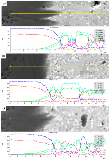 The SEM + EDS line profiles across the present oxidic layer for all the MA + SPS alloys are shown in Figure 10. From the EDS line profiles, it is visible that the oxidic layer is on the outside containing only Al and O, whose atomic ratios corresponds to Al2O3. Its presence is visible throughout the entire oxidic layer. However, the content of Al2O3 changes near the oxide–alloy interface, while the content of Si and Fe increases. The ratio of present oxides is changing, favoring the presence of SiO2 and FeO-based oxides. The thickness of this sublayer, where the content of SiO2 and FeO-based oxides increased, was approximately 0.5 µm for the first two alloys.