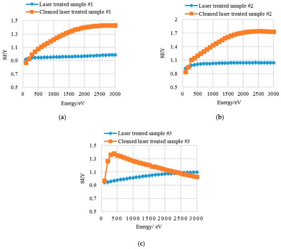 In Figure 2a, when the primary energy (Ep) is less than 200 eV, the SEYs of cleaned laser treated sample #1 are slightly lower than those of the uncleaned one, while at 300 eV ≤ Ep ≤ 3000 eV, the SEYs of cleaned laser treated sample #1 are obviously higher than those of the uncleaned one. The maximum SEY of uncleaned and cleaned laser processed sample #1 are 0.99 and 1.43, respectively, with a corresponding energy (Emax) of 3000 eV and 2700 eV, respectively.