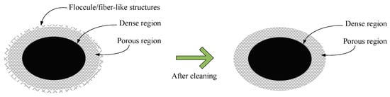 As indicated in Table 1, the surface roughness of the laser processed aluminum alloy in samples #1, #2, and #3 decreased about 8–12% after ultrasonic cleaning. The surface roughness difference induced by ultrasonic cleaning may be one of the main reasons for SEY changes. The decrease of surface roughness may be related to the removal of floccule/fiber-like structures. The mechanism of the effect of ultrasonic cleaning on surface morphology change is shown in Figure 4. More precisely, the floccule/fiber-like structures were stripped out from the sphere/spheroidicity-like micron level grains during ultrasonic cleaning.