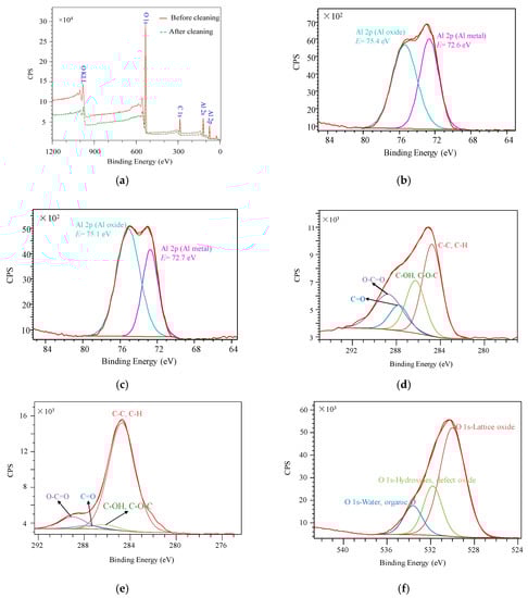 (3) Thirdly, with the increase of carbon content of around 7.1%, the aluminum and oxygen contents decreased about 1.91% and 5.2%, respectively, after cleaning. The Al content decreases slightly after cleaning, the concentration of Al metal decreased by 9.5%, and the concentration of Al oxide increased. The oxygen concentration decrease can be ascribed to the decrease of lattice oxide parts after cleaning. The peak fitting of C 1s curve indicates that the carbon content increase may be caused by the introduction of more adventitious carbon attached on the cleaned surface. Because more sphere/spheroidicity-like grains are formed after cleaning, the surface areas’ increase may induce more adventitious carbons attached on the cleaned laser treated surface.