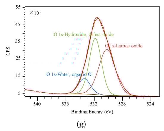 The uncleaned and cleaned sample #1 oxide surfaces were decomposed into lattice oxide, hydroxides/defect oxide, and water/organic O parts [37,38,39], as indicated in Figure 5f,g. The main peaks at 530.0 (±0.1) eV are due to lattice oxide bonds. The peaks at 531.8 (±0.1) eV are assigned to hydroxides/defect oxide bonds. The peaks at 533.5 (±0.1) eV can be attributed to water/organic O bonds. The concentration of lattice oxide and water-organic O parts decreased about 18.9% and 1.3%, respectively. The content of hydroxides/defect oxide part increased about 20.2% after ultrasonic cleaning. Considering the element concentrations of laser treated sample #1 exhibited in Table 2, the oxygen concentration decrease can be ascribed to the decrease of lattice oxide content after cleaning.