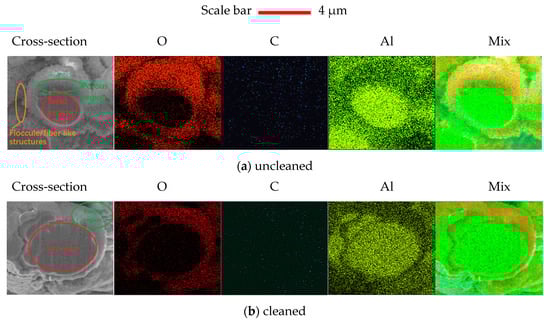 The cross section morphologies and compositions of uncleaned and cleaned laser treated sample #1 are shown in Figure 6. The fracture surfaces were cut by a focused ion beam system. The porous and dense regions are labeled in Figure 6a,b. C element is nearly uniformly distributed on the porous and dense regions, due to the adventitious carbon adhesion on the cut and uncut surfaces. O content can be detected mainly from the floccule/fiber-like structures and porous region for cleaned and uncleaned surfaces. The density of the Al element in the dense region is much higher than that in the porous region. According to the XPS results above, the concentration of Al oxide in the floccule/fiber-like structures and porous region is higher than that in the dense region. This means aluminum alloy can react with active gases like oxygen in air during laser processing.