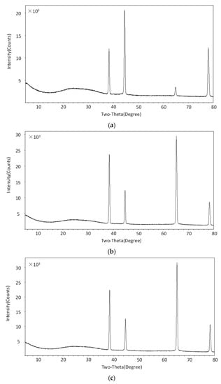 The XRD results of untreated aluminum alloy, laser treated aluminum alloy, and cleaned laser treated aluminum alloy sample #1 are shown in Figure 7. After laser processing, the positions of the Bragg reflection peaks were the same, while the half maximum intensity changed. The half maximum intensity variations are corresponding to the lattice microstrain [40]. It can be speculated that laser processing could induce the lattice microstrain of the aluminum alloy samples. The shapes of the laser treated aluminum alloy and cleaned laser treated aluminum alloy are basically the same. This indicates that the ultrasonic cleaning did not change the lattice parameters of the laser treated aluminum alloy sample by and large.