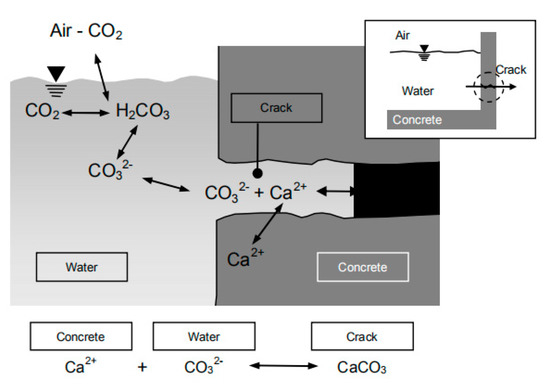 Self-repairing concrete has been a subject of research attention since it was first presented by Dry in 1994 [8]. The self-repairing mechanisms can be described as follows. Firstly, with regard to young concrete, unreacted cement particles can hydrate to form calcium carbonation precipitation, as shown in Figure 1 [9]. For older concrete, carbon dioxide obtained from the cement hydration can react with calcium hydroxide to produce calcium carbonation precipitation. Secondly, debris in water could seal cracks [10]. Self-repairing can be divided into two methods, self-healing and self-sealing. The difference between self-healing and self-sealing is whether the mechanical properties recover. The self-healing method was classified as autogenous healing and autonomic healing [11]. Beyond that, it is divided into three aspects: intrinsic healing, vascular healing, and capsule-based healing [8]. The autogenous healing method relies on chemical or physical substances stored in concrete to seal cracks, which is the same as intrinsic healing. By comparison, vascular healing and capsule-based healing deliver healing agents to repair cracks such as epoxy resin, acrylics, polyurethanes and Bacillus sphaericus LMG 22557 by employing hollow tubes and capsules, respectively [5,12,13,14]. To simplify the classification, self-healing concrete is referred to as either autogenous healing or agent-based healing in this article. According to previous research, the agent-based healing method can heal cracks smaller than 970 μm, while cracks no wider than 320 μm could be sealed by the autogenous healing method [15]. However, most of the chemical healing agents utilised for agent-based healing are environmentally unfriendly, as mentioned before. Moreover, maintaining plastic tubes and capsules during the service life of concrete structures is also problematic [16,17]. Thus, the self-sealing method inspired by autogenous healing is studied in this article.