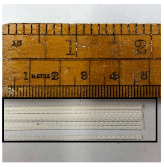 The construction fibre shown in Figure 2, DURUS S500, was provided by the ADFIL Construction Fibre Company, Zele, Belgium. The properties of the fibre are listed in Table 1. Moreover, Ordinary Portland Cement type I (CEM I 52.5 N) was employed as a binder for casting concrete samples in accordance with BS EN 197-1 [29]. Furthermore, aggregates smaller than 4.75 mm were applied as fine aggregates according to BS EN 12620:2002 [30]. Moreover, tap water from the Civil Engineering Laboratory of the University of Birmingham (Birmingham, UK) was used as the batch water in this article. The 180- and 400-micron crumb rubbers provided by Lehigh Technologies Incorporation (Atlanta, GA, USA) were mixed at a ratio of 1:1, as shown in Figure 3, to substitute for 5% of the sand.