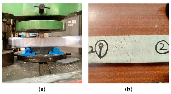 Three prisms (W100 mm × H100 mm × L500 mm) were tested on the 28th day after casting concrete by employing the same machine for testing the splitting tensile strength with the same loading rate, in accordance with BS EN 12390-5 [35]. The difference was that the loading pad for the splitting tensile strength test was changed to two loading rollers.