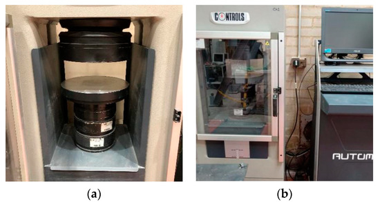 The compressive strength test setup is shown in Figure 5a. The test was conducted by applying a machine called Controls Automax (Milan, Italy) (shown in Figure 5b) based on BS EN 12390-3 [33]. Nine cubes (100 mm) of the same mix were tested as a batch on the 7th, 14th, and 28th days. In order to obtain more accurate compressive strength measurements, the cubic samples were heated in an oven at 80 °C for 1 h and then cooled to room temperature before testing. Furthermore, both surfaces of the loading pad and cubes were cleaned to avoid errors caused by eccentric compression.