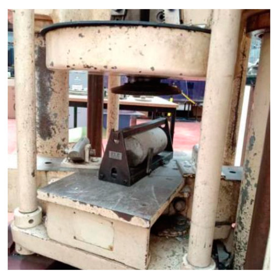 Based on BS EN 12390-6 [34], three cylindrical samples (Ø100 mm × L 200 mm) were utilised to measure the splitting tensile strength of concrete on the 28th day [34]. The machine for testing the splitting tensile strength was called Avery-Dension, AD-T42 (OH, USA), shown in Figure 6. In order to implement the test, samples were heated and cooled and then the surfaces of the samples and the machine were cleaned. Moreover, the press bar of the machine should be placed in the middle of the loading pad and the samples. The descending rate of the loading pad was kept steady and uniform at 0.02 to 0.05 MPa/s until the samples failed and then the splitting tensile strength value was recorded.