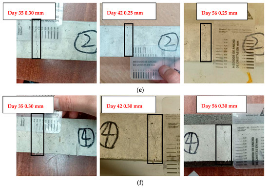 Crack sealing phenomenon of samples. (a) Changes in crack width of Mix 2 on days 35, 42, and 56; (b) changes in crack width of Mix 3 on days 35, 42, and 56; (c) changes in crack width of Mix 4 on days 35, 42, and 56; (d) changes in crack width of Mix 5 on days 35, 42, and 56; (e) changes in crack width of Mix 6 on days 35, 42, and 56; (f) changes in cracks width of Mix 7 on days 35, 42, and 56.