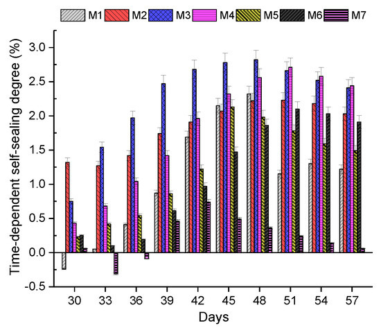 Figure 11 shows the time-dependent self-sealing degree of concrete in the seven mixes. With regards to Mix 2, Mix 6, and Mix 7, the self-sealing degrees of them went through slight drops in the first five days after crack generation, which indicates the expansion of cracks. The self-sealing degree of Mix 7 decreased from 0.06 to −0.31% between the 30th and 33rd days. This means that the cracks in Mix 7 expanded in comparison with the original cracks. A possible reason for crack expansion could be that precipitation for sealing cracks could be easily seen in the early sealing stage because of the tension of water. Meanwhile, the self-sealing degree of Mix 2 and Mix 6 increased until the 51st day. Regarding Mix 7, the self-sealing degree increased from the 33rd to the 42nd day, and then dropped from 0.74% to 0.06% between day 42 and day 58. With regards to the rest of the mixes, the self-sealing degree of Mix 1, Mix 3, Mix 4, and Mix 5 increased from day 30 to day 48, by day 48, by day 51, and by day 45, respectively. Then the self-sealing degree of these mixes started dropping in the next few days. With regards to Figure 11, it can be seen that EFHDFRC in all mixes had the maximum self-sealing degree between day 42 and day 51 after casting concrete. This could be because the fibre can effectively bridge cracks at the early stage of sealing. However, the tension of fibres would be decreased and then the ability to combine cracked samples of fibres would be reduced because of long immersion in water.