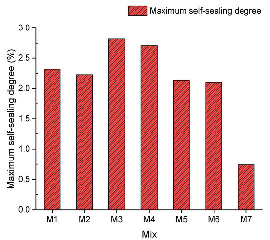 In accordance with Figure 12, the maximum self-sealing degree, which indicates the highest percentage of sealed cracks of concrete, in each mix is revealed. According to Figure 12, the maximum self-sealing degree decreased from 2.32% to 2.23%, which represents a negligible drop from Mix 1 to Mix 2, by incorporating 5% crumb rubber. It could be interpreted that 5% crumb rubber had little effect on the maximum self-sealing degree of concrete, compared with plain concrete [43]. Compared with Mix 2 and Mix 3, the maximum self-sealing degree soared from 2.23% to 2.82% with a sealing efficacy increase of 20.92%. The maximum self-sealing degree of samples in Mix 3 was the highest, 2.82%. This means that the fibre could bridge concrete blocks to prevent further expansion and stimulate the self-sealing performance. Furthermore, the fibre could act as cores of precipitation, which could help to seal cracks by increasing the speed of precipitation formation. Subsequently, the maximum self-sealing degree plummeted from 2.82% to 0.74% between Mix 3 and Mix 7. A first possible explanation for this could be that excessive fibre lost the ability to bridge cracked samples as a result of a long soaking in the curing tank. Another possible reason could be that the cracks were filled up with the fibre and there was no space for forming deposits to seal cracks. The reason is that fibre has a higher density of distribution in cracks than gravel, and hence more chances of occupying the space for the rehydration of unreacted cement. Moreover, the binding force between the fibre and concrete was not as strong as that between the precipitation and concrete. Moreover, the ultrasound velocities passing through the fibre and deposition are different. Thus, the maximum self-sealing degree dropped with a growing proportion of the fibre.