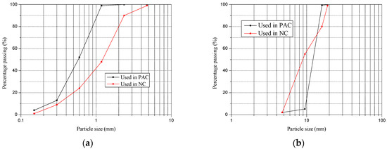 A total of six mixtures were designed in this research, as presented in Table 3. All mixtures consisted of cement, sand, coarse aggregate, water reducer and water. The cement was Ordinary Portland Cement with a grade of 42.5 (GB 175-2007 [44]). The Chemical compositions and physical properties of this cement were summarized in Table 4. The water reducer was a polycarboxylate superplasticizer with a solid content of 40%. The water was from the tap (faucet). For PAC, the properties of the sand were an apparent density of 2610 kg/m3, modulus of fineness of 3.58, bulk density of 1450 kg/m3, maximum size under 2.36 mm and the particle size distribution as shown in Figure 1a. The properties of coarse aggregate were the crushing index 9.5%, loose bulk density 1360 kg/m3 and the apparent density 2520 kg/m3, while the particle size ranged from 4.75 mm to 19 mm, and the particle size distribution as presented in Figure 1b. For NC, the properties of coarse aggregate were an apparent density of 2625 kg/m3, modulus of fineness of 2.68, bulk density of 1430 kg/m3 and the particle size ranged from 0.15 mm to 4.75 mm, while the particle size distribution is as shown in Figure 1a. The properties of coarse aggregate were a crushing index of 8.6%, loose bulk density of 1420 kg/m3, apparent density of 2520 kg/m3, and its particle size ranged from 4.75 mm to 19 mm, while the particle size distribution is as presented in Figure 1b.