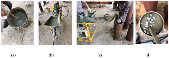 Preparation process of preplaced aggregate concrete-filled steel tube (CFT-PAC) specimens. (a) Preparation of grouting mortar; (b) Grouting device; (c) Grouting process; (d) Grouting effect.