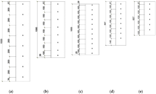 Location of strain gauge on the steel tube: (a) CFT-PAC-8; (b) CFT-PAC-7; (c) CFT-PAC-6; (d) CFT-PAC-5; (e) CFT-PAC-1~CFT-PAC-4, CFT-NC-1~CFT-NC-3.
