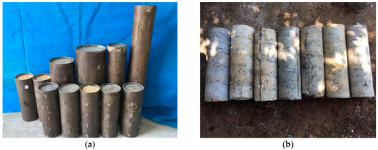 The cold-formed circular steel tubes used in this research were cut according to the required sizes. For CFT-NC columns, the concrete was mixed firstly and then was filled into the steel tubes with vibration. For CFT-PAC columns, the grouting mortar was prepared firstly, then the coarse aggregate was cast into the steel tubes in layer, and finally the grouting mortar was injected into the void between coarse aggregate from bottom to top by pumping (preparation process as shown in Figure 2). The layered height of the coarse aggregate filled into the steel tubes was about 200 mm. The steel–concrete interface length for CFT-NC and CFT-PAC were all approximately 50 mm shorter than the length of the steel tubes. All specimens were cured for 28 days in an indoor environment with 20 ± 5 °C and RH > 95%.