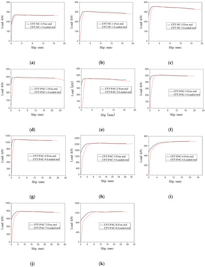 Load-slip curves at loading end and free end for specimens. (a) CFT-NC-1; (b) CFT-NC-2; (c) CFT-NC-3; (d) CFT-PAC-1; (e) CFT-PAC-2; (f) CFT-PAC-3; (g) CFT-PAC-4; (h) CFT-PAC-5; (i) CFT-PAC-6; (j) CFT-PAC-7; (k) CFT-PAC-8.