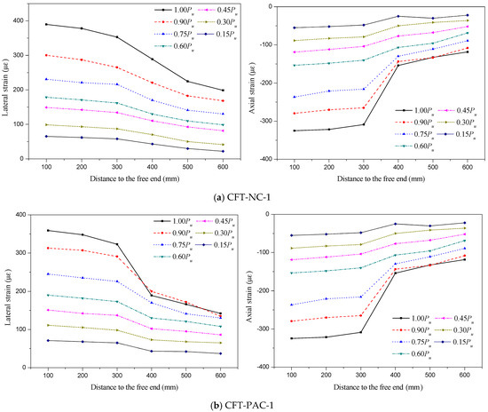 The typical axial and lateral strains distribution of steel tube along height were shown in Figure 7. In these figures, the strain is the ordinate, the distance to the free end is represented by the abscissa. All specimens had a similar variation tendency on the axial and lateral strains distribution of steel tube along height, so the experimental results of CFT-NC-1, CFT-PAC-1 and CFT-PAC-8 were selected to analyze the axial and lateral strains distribution of the steel tube along height. As shown, at the initial stage of loading, the axial and lateral strains were all relatively small and were approximately linear with the distance to the free end. It indicated that the deformations at core concrete and steel tube were synchronous, where no obvious slip was occurred between core concrete and steel tube. With the increasing of applied load, the difference values of strain between the free end and loaded end became larger, and especially the applied load exceeded about 70% of the peak load. It indicated that the slip would occur when the applied load exceeded about 70% of the peak load which was verified by the test phenomena. The lateral strain and axial strain were all significantly affected by the location of strain. The higher the distance to the free end was, the smaller the lateral strain and axial strain would be.
