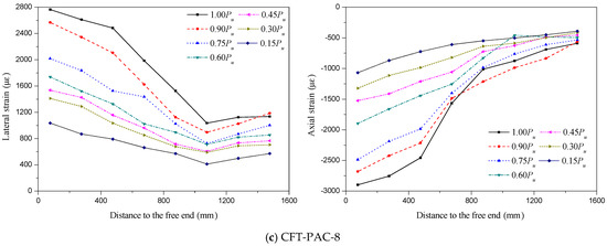 Typical lateral strain and axial strain distribution of the steel tube along the height. (a) CFT-NC-1; (b) CFT-PAC-1; (c) CFT-PAC-8.
