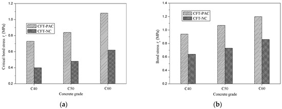 Figure 8 presented the variation of critical bond stress (τs) and bond stress (τu) with concrete strength and concrete type. Compared with CFT-NC, the critical bond stress (τs) and bond stress (τu) of CFT-PAC were larger at the same concrete grade. For critical bond stress (τs), replacing NC by PAC in CFT would lead to an increment of 82.5% for C40, 75.0% for C50 and 67.7% for C60. Meanwhile, for bond stress (τu), replacing NC by PAC in CFT would lead to an increment of 46.9% for C40, 46.6% for C50 and 39.5% for C60. The higher critical bond stress (τs) and bond stress (τu) of CFT-PAC might be mainly due to the lesser shrinkage strain of PAC as compared to NC. Because of the higher coarse aggregate content and lower cement content, the shrinkage strain of PAC was less than that of NC [36]. At the same concrete strength, the chemical adhesion, friction and mechanical interlocking between PAC and steel tube would be greater than that between NC and steel tube. Thus, the critical bond stress (τs) and bond stress (τu) of CFT-PAC was higher than that of CFT-NC at the same concrete strength. It indicated that applying PAC in CFT was beneficial to enhance the critical bond stress (τs) and bond stress (τu) of CFT. With the concrete strength increased, the critical bond stress (τs) and bond stress (τu) of CFT-PAC added that which was in accordance with the variation of CFT-NC.