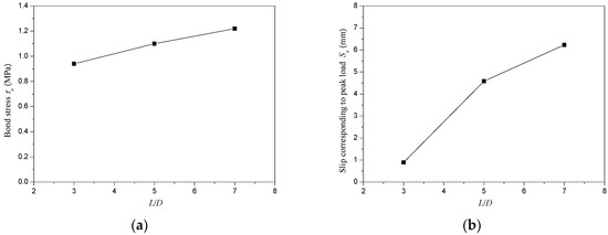 Variation of bond stress (τu) and slip corresponding to peak load (Su) with L/D ratio. (a) Bond stress (τu); (b) Slip corresponding to peak load (Su).