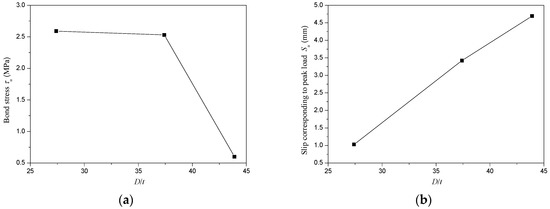 Figure 10 presented the variation of bond stress (τu) and slip corresponding to peak load (Su) with D/t ratio. In this research, the D/t ratios were changed by varying the diameter of steel tube while maintaining the thickness of steel tube invariable. The bond stress (τu) reduced with the increase of D/t ratio. A reduction of 2.3% in bond stress (τu) was obtained as the D/t ratio augmented from 27.4 to 37.4, while a reduction of 76.3% in bond stress (τu) was obtained as the D/t ratio increased from 37.4 to 43.9. It meant that if the D/t ratio exceeded 37.4, increasing D/t ratio would cause a drastic reduction of bond stress (τu) which might significantly affect the bond-slip behavior of CFT-PAC. This was mainly because when the diameter of external diameter of steel tubes exceeded 299 mm, increasing the diameter of external diameter of steel tubes led to a drastic increase in the shrinkage strain of core concrete. The higher shrinkage strain of core concrete would reduce the adhesion between core concrete and steel tube, and then would decrease the bond stress of CFT-PAC. The slip corresponding to the peak load (Su) increased almost linearly with the D/t ratio, as shown in Figure 10. The observation of the variation tendency of bond stress (τu) and slip corresponding to peak load (Su) of CFT-PAC with D/t ratio were similar to the circular steel tube filled with other types of concrete [16,30,45].