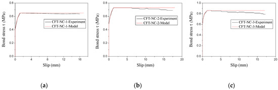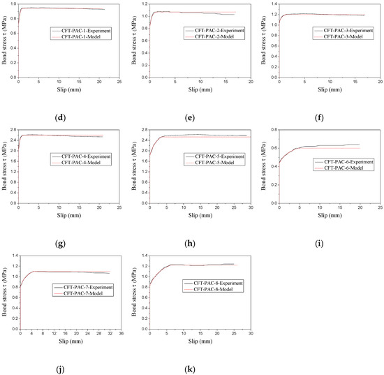 On the basis of the experimental load-slip curves (as shown in Figure 6), the bond stress–slip curves of CFT-PAC at the free end could be ascertained as displayed in Figure 11. It could be found that bond stress–slip curves could be roughly divided into three branches: a branch with no slip, a branch which slip increased with rise of load, and a branch which load basically remained unchanged as the slip increased. As similar stress–slip curves had been reported on the CFT columns [46] and MS-CFT columns [45], the bond stress–slip relationship model for CFT columns and MS-CFT columns might be also utilized to depict the bond stress–slip relationship of CFT-PAC. In this research, an attempt to establish the relationship between the bond stress and slip of CFT-PAC following the existing bond stress–slip relationship of MS-CFT columns were given as follows: