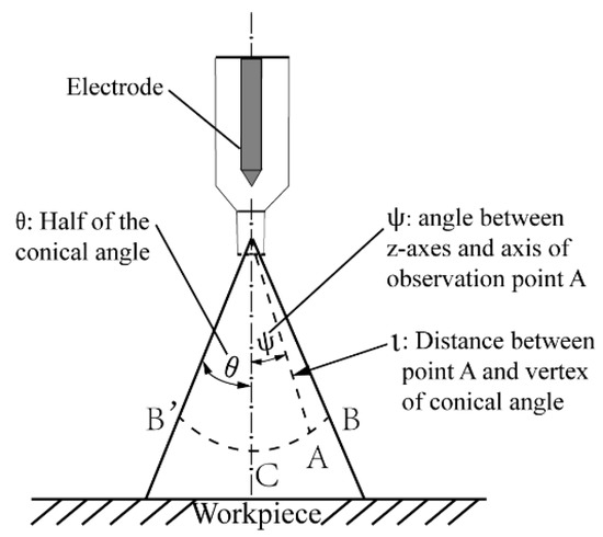 where I is the welding current calculated through Equation (17), is half of the conical angle, is the angle between the z-axes and the axis of observation point A, and is the distance (cm) between point A and the vertex of the conical angle.