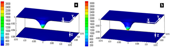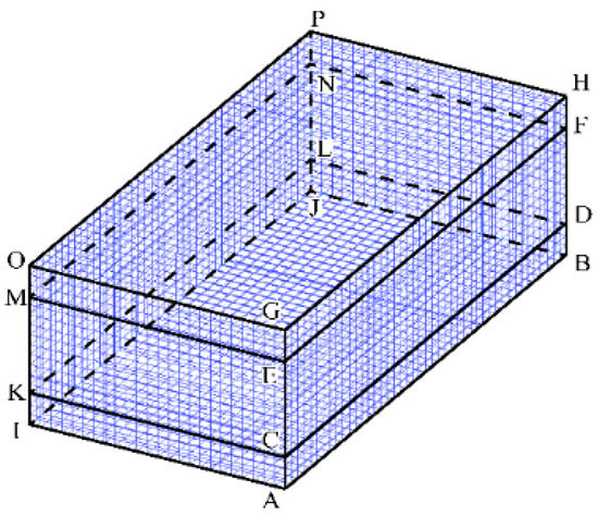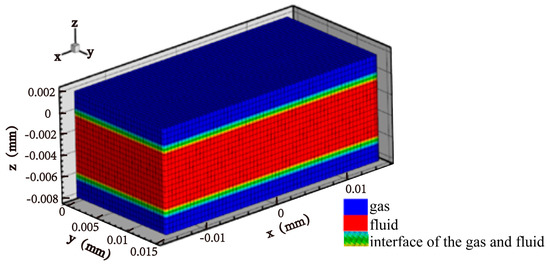 The computational domain for the VPPAW model is shown in Figure 5. The domain is symmetric about the x–z plane. To improve the computational efficiency, the length (x-axes), width (y-axes) and height (z-axes) of the workpiece are 30 mm, 15 mm, and 10 mm, respectively. The domain is divided into three layers, the middle of which is a 6-mm fluid layer. The upper and lower layers are 2-mm air layers. The minimum grid size is 0.3 mm.