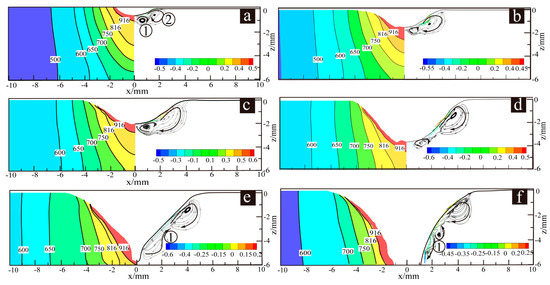 For cases a–f, the temperature gradient inside the weld pool was studied to further explore the mechanism of the weld pool material flow behavior to weld pool stability. The temperature value of the z = −5 mm straight line on the xoz plane was extracted. Since the weld pool is symmetrical, the temperature value within 3.5 mm (from the keyhole center to its right side) is shown in Figure 15.