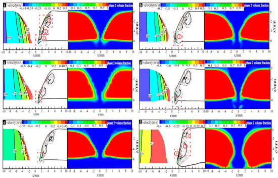 In Figure 14a–f, under the action of the surface tension and the digging effect of the arc pressure, the upper molten metal of the weld pool flows outwards and then forms clockwise, as shown in Figure 14a ①; The molten metal in the middle of the weld pool flows upwards and inwards, as shown in Figure 14a ②, under the digging action of the arc pressure, the electromagnetic force, and the effect of clockwise eddy flow in Figure 14a ①; in particular, the material flow behavior in the lower part of the weld pool is quite different. In case a, case c and case e, the molten metal forms confluences towards the keyhole center, as shown in Figure 14a ③, at the maximum velocities of 0.45 m/s, 0.55 m/s and 0.6 m/s, respectively, with moderate temperature gradients (the slopes values being greater than 0.7 and less than 0.87), as shown in Figure 15b. In case b and case d, the molten metal of the weld pool bottom flows downwards and outwards, as shown in Figure 14b ①, at the maximum speed of 0.7 m/s and 0.8 m/s, respectively, under the action of the large surface tension caused by the relatively large temperature gradients (slope value ≥ 0.87) in the weld pool, as shown Figure 15b. In case f, the molten metal flows as shown in Figure 14f ① ②, which makes the molten metal of the weld pool increase under the joint action of small arc pressure and surface tension. Although the weld pool metal can still form the confluence, as shown in Figure 14 f ③, the weld pool with a large amount of molten metal collapsed under the action of gravity.