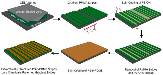 A schematic illustration of formation of hierarchically ordered polystyrene-block-polydimethylsiloxane (PS-b-PDMS) stripes with a gradient fashion in terms of the stripe width, w, and the center-to-center spacing, λc-c. Upper left panel: a poly (methyl methacrylate) (PMMA) toluene solution was confined and evaporated in the wedge-on-Si geometry. Upper middle panel: PMMA stripes were produced via controlled evaporative self-assembly (CESA). Xn (n = 1–3) is the stripe position from the wedge/Si contact center. Upper right panel: hydroxyl-terminated polystyrene (PS-OH) dissolved in 1,2-dichloroethane was spin-coated onto a PMMA patterned sample. Lower right panel: PMMA stripes and PS-OH residue were washed away using toluene after chemical anchoring of PS-OH onto a silicon native oxide surface. Lower middle panel: high PS-b-PDMS dissolved in toluene was spin-coated and then annealed using toluene vapor at 35 °C. Lower left panel: Surface tension-driven dewetting (i.e., preferential segregation) of the PS-b-PDMS thin film led to hierarchically structured PS-b-PDMS stripes on chemically defined regions.