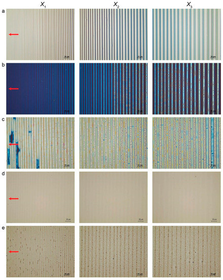 As clearly displayed in Figure 2, the PMMA line patterns were observed with OM in reflection mode, appearing in a gradient fashion in terms of w and λc-c, ranging from 7.2 ± 0.2 μm and 12.4 ± 0.3 μm at the innermost region X1 to 10.4 ± 0.1 μm and 17.5 ± 0.2 μm at the intermediate region X2 and to 13.3 ± 0.2 μm and 21 ± 0.3 μm at the outermost region X3, where Xn is the distance away from the wedge/Si contact center (upper middle panel of Figure 1 and Figure 2a). The dimensional features of the resulting PMMA stripes can be readily controlled by tuning the height of the wedge lens (i.e., capillary height; vertical distance from the Si substrate) [7]. For the present study, the stripe thickness h was not investigated because there was no effect on the whole experimental process. We first examined the physical adsorption of the PMMA segment on the Si substrate. The PMMA stripes were completely removed by vigorously washing with acetone. As previously well-described [9], the PMMA segments were physically adsorbed on the Si substrate with ~2 nm thick native oxide layer via hydrogen bonding between the hydroxyl groups of silicon oxide and the carboxylic groups of the PMMA segments, thereby leading to chemically defined gradient surfaces [7,46]. Thickness of this ultrathin layer was approximately ~2.2 Å (i.e., lengths of hydroxyl and carboxylic chains ≈ 0.97 Å and 1.23 Å). It is noteworthy that a chemically defined surface composed of alternating PMMA-rich and PS-rich stripes can be obtained at the micrometer scale in a lithography-free manner. In order to further scrutinize this adsorption phenomenon, a droplet of deionized water was directly placed on top of the surface with only PMMA adsorption layer (without PS-OH brush) and the three-phase contact line of water drop was observed with OM in reflection mode to visualize undulation of the contact line, which was mainly driven by different surface energies of hydrophilic native oxide and hydrophobic PMMA surface (Figure S1b). Further confirmation was made using XPS, revealing that a hydrocarbon peak (C-C and C-H) and a weak carboxylic peak were still maintained at a binding energy of 285.0 eV and at 288.8 eV before and after acetone washing, as displayed in Figure S1c. This strongly suggests that the chemical anchoring of the PMMA segments into the Si deposited with a very thin native oxide layer. This is in good accord with a previous study [7,46]. Subsequent surface treatment wth a PS-OH brush layer was conducted at 150 °C for 2 h triggered chemical anchoring of PS-OH onto a non-patterned Si surface (i.e., PS-rich surface) because of condensation reaction between hydroxyl groups of PS-OH and native oxide layer (Figure 2b,c) [47]. This treatment benefited the combined assemblies of preferential segregation of the PS-b-PDMS thin film from PMMA-rich regions to PS-rich regions (i.e., surface-tension-driven dewetting of di-BCP from physically adsorbed surfaces) at the micrometer scale and the solvent-vapor-mediated hierarchical structuring of the laying-down cylinders of the PDMS domains at the nanometer scale. Indeed, the Si right after Piranha cleaning, PMMA-adsorbed surface, and PS-OH brush-treated surface displayed different contact angles (CA) of 20.08°, 65.43°, and 85.31°, respectively (Figure S2). The PS-b-PDMS toluene solution with concentration of 10 mg mL-1 was spin-coated on top of the chemically defined gradient surface (Figure 2d) and then annealed for microphase-separation with toluene vapor. Over large areas of the PS-rich stripes with a width gradient, thin films PS-b-PDMS copolymer with high (~0.26; several times larger than polystyrene-block-poly (methyl methacrylate) (PS-b-PMMA)) were thermodynamically self-assembled into hierarchically ordered nanostructures [48,49]. BCPs with high are often suffering from slow self-assembly kinetics, which is highly expected with exponential decrease of the chain mobility [48,49].