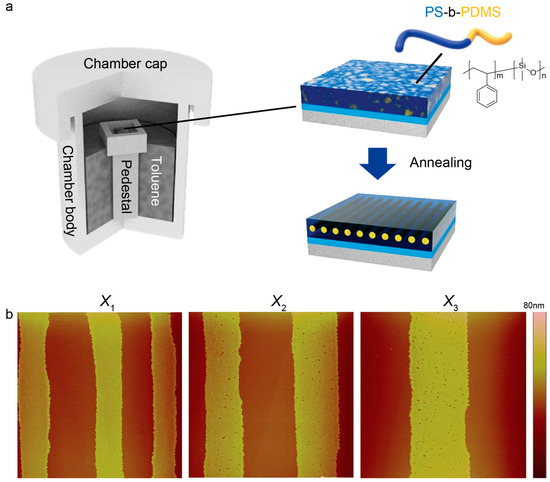 The self-assembly of diblock copolymer (di-BCP) composed of two chemically incompatible chains covalently linked at one end have gained considerable attention for the past two decades as an unconventional bottom-up approach to create a wide range of spatially-ordered nanoscopic domains, including spheres, cylinders, gyloids, and lamellae, that are strongly depending on the volume fraction of components [25]. The self-assembled di-BCP morphologies with domain size ranging from 10 to 100 nm can be effectively controlled by thermal annealing (TA), or solvent vapor annealing (SVA) (i.e., solvent vapor annealing above room temperature), thereby offering templates and scaffolds for the coordination of nanostructured materials [11,18,26] and devices (e.g., memory [27] and energy harvesting devices [28,29]). Thus, the control over the orientation and lateral ordering of nanoscale blocks is of critical importance in the self-assembly of di-BCPs. To date, various kinds of techniques have been exploited for securing the configurational orientation and ordering of blocks such as mechanical shearing [30], external electric field [31], temperature gradient [32], solvent-vapor annealing [33,34], controlled interfacial interaction [35], topographically [36,37] or chemically patterned surfaces [9,38,39], laser ablation [40,41], and so on. Particularly, among them, the use of topographically and chemically patterned surfaces for direct self-assembly (DSA) of di-BCPs suffers from high processing cost and complicated multi-step procedures due to top-down lithography-based process. Therefore, there is still a challenge to develop a noble and facile strategy for the preparation of chemically modified surfaces for effective DSA of di-BCPs. Recently, we successfully demonstrated hierarchically ordered nanostructures self-assembled on chemically distinct gradient surfaces driven by the unfavorable interfacial–interaction–destabilization of thin films of di-BCP with a low segment–segment interaction parameter, χ, (i.e., Flory-Huggins interaction parameter) [9]. However, despite this great effort, a functional high χ di-BCP with slow self-assembly kinetics because of the slow chain mobility or diffusivity (i.e., stronger segregation of A-A blocks than A-B blocks) has not much been exploited [40,41,42,43,44].