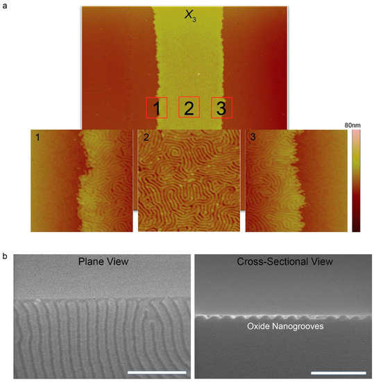 (a) Close-up AFM phase images (image size = 2 × 2 μm2) corresponding to the solid red-colored squares marked in 1, 2, and 3 in a AFM height image of the outermost region (X3); (b) FE-SEM images with scale bars of 200 nm (left: plane view and right: cross-sectional view) oxide nanogroove structures created through CF4 plasma etching and O2 plasma treatment.
