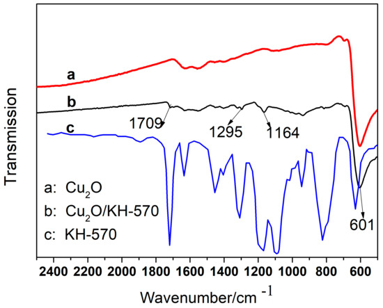 NPs have a strong tendency to undergo agglomeration. Surface modification of the metal oxide NPs with physically (by physisorption) or chemically (through covalent bonding) routes have been employed to overcome this problem. Surface modification refers to the use of surface additives to change the surface state of particles, such as the surface atomic layer structure and functional groups, surface hydrophobicity, electrical properties, chemical adsorption and reaction characteristics. Through surface modification, it can improve the dispersibility, durability and weatherability of the powders, and improve also the surface activity. Thus, new physical and chemical properties can be produced on the surface of the particles. Surface modification of NPs is that a chemical reaction occurs on their surface, which introduces some new interaction forces between the two phases, such as van der Waals forces, hydrogen bonds or coordination bond interactions, and the combinations of ionic or covalent bonds [28]. The infrared spectrum of cuprous oxide before and after KH570 modification and KH570 is shown in Figure 3. The Figure 3a curve shows that the characteristic features in the FTIR spectrum of 0-Cu2O are the absorption bands corresponding to the Cu–O at 601 cm−1. After the Cu2O was modified by KH570, the three new characteristic features in the FTIR spectrum of M-Cu2O are the absorption bands corresponding to the α, β unsaturated esters –C=C–CO–OR– of KH570 at 1709 cm−1, the sp2 C–O stretching at 1295 cm−1, the sp3 C–O stretching at 1164 cm−1, respectively (Figure 3b). These three peaks prove the existence of the ester group after the reaction; that is, the purpose of surface modification of Cu2O by KH570 is achieved.