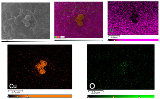 The scanning electron microscopy (SEM) and energy-dispersive X-ray spectroscopy (EDS) of 0-Cu2O/PP and M-Cu2O/PP are given in Figure 5 and Figure 6. As shown in Figure 5 and Figure 6, the agglomerates of unmodified Cu2O in the PP matrix were found, but the KH570-modified Cu2O was finely dispersed in the PP matrix, without agglomeration. These results illustrate that unmodified inorganic superfine cuprous oxide has poor surface activity, resulting in aggregation, but the surface of superfine Cu2O were modified with KH570 to introduce organic functional groups (such as the ester group) on the surface of Cu2O (Figure 3), and improve the compatibility of the Cu2O surface (hydrophilic) with a hydrophobic polymer surface. This also increases the dispersion stability in organic media [47]. These results also reveal that the surface of Cu2O was successfully modified by the silane coupling agent KH-570.