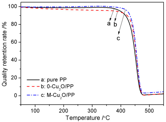 Polypropylene (PP) is one of the five general-purpose plastics. It is cheap, non-toxic and tasteless, and has excellent mechanical properties. It is widely used in electrical appliances, automobiles, daily necessities, etc. [1,2,3,4], but its impact toughness is poor, its thermal stability is also poor, and it is easy to burn. Disadvantages greatly limit the application of PP in certain engineering fields. In order to broaden the application range of PP, the modification of PP has become a research hotspot. Making composite materials is a good way. Adding Cu2O to the PP matrix can improve the heat resistance of the composite. The TGA curve of Cu2O/PP at the rate of 10 °C/min was shown in Figure 7. As can be seen from Figure 7, the T−5% (temperature of weightlessness 5%) values of pure PP, 0-Cu2O/PP and M-Cu2O/PP from the TGA curve were 398.6 °C, 383.4 °C and 422.8 °C, respectively. The T−5% value of 0-Cu2O/PP was lower than the value of pure PP, due to the evaporation of bound water between Cu(OH)2 molecules, as shown in Figure 4. The T−5% value of M-Cu2O/PP was higher than the value of pure PP and 0-Cu2O/PP, because the bonding force between Cu2O and PP was improved, after the Cu2O was modified by the silane coupling agent KH570. In the T−7% (temperature of weightlessness 7%) –T−100% (temperature of weightlessness 100%) range of M-Cu2O/PP and 0-Cu2O/PP composites are higher than that of pure PP. The T−7% values of M-Cu2O/PP, 0-Cu2O/PP and pure PP were 432.1 °C, 422.3 °C and 416.3 °C, respectively. The Tmax (temperature of the maximum weight loss rate) values of M-Cu2O/PP, 0-Cu2O/PP and pure PP were 485.2 °C, 483.4 °C and 479.6 °C, respectively. Obviously, the addition of Cu2O significantly improved the thermal stability of the PP matrix, due to the strong interaction between superfine Cu2O and the PP chain, which hinders the rupture of this PP chain. Combining Figure 4 and Figure 7, these results indicate that the thermal stability of PP can improve by adding inorganic metal oxide Cu2O, especially modified-Cu2O. Therefore, based on the potential bacteriostasis of cuprous oxide, the low cost of PP, and the results of this study, it is predicted that Cu2O/PP composites can be used in infant preparation (such as in milk bottles) with low cost and good thermal stability in the near future.