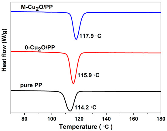 Figure 8 and Figure 9 show the DSC curves for pure PP and Cu2O/PP composites. The crystallizing temperature of PP is increased by approximately 3 °C, when Cu2O is added to the PP. However, our results show that an increase of 3 °C in the crystallization temperature is achieved, implying that the Cu2O is a nucleating agent with a rather low efficiency, comparable with other widely published sources [48,49,50,51]. It was also found that the melting temperature of PP is higher than that observed for the Cu2O/PP composites.