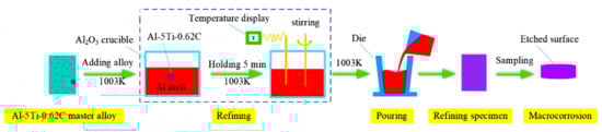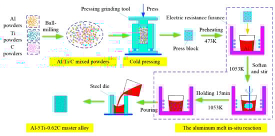Al-5Ti-0.62C master alloy was prepared by the aluminum melt in-situ reaction, commercial pure aluminum (99.7 wt.%, A99.7), pure Al powder (99.0 wt.%, 80–100 μm), pure Ti powder (99.0 wt.%, 45–65 μm), and graphite powder (99.0 wt.%, 10–20 μm) were used as main raw materials (Tianjin Zhiyuan Chemical Reagent Co., Ltd, Tianjin, China). First, the powders were blended in the Pulaerisette-5 high-speed planetary ball mill (Nanjing Leibu Technology Industry Co., Ltd, Nanjing, China) at 350 r/min for 3 h, and the ball to material ratio is 3:1. Then, the mixed powders were pressed into a cylindrical preform in a stainless steel mold 25 mm in diameter and 50 mm in height on an AG-10TA universal test stretching machine (Shimadzu Corporation, Kyoto, Japan), and the uniaxial pressure was set to 50 Mpa. Next, the preform was preheated to 473 K in a drying oven. Simultaneously, a certain amount of A99.7 ingots were melted in alumina crucible by using a SG-7.5-10 type crucible furnace (Zhonghuan experimental furnace corporation, Tianjin, China), the temperature was heated to 1053 K. Subsequently, the preform was added into the A99.7 melt and held for 15 min to synthesize the Al-5Ti-0.62C master alloy, the flow chart is shown in Figure 1.